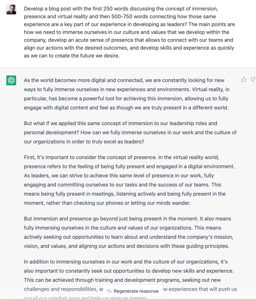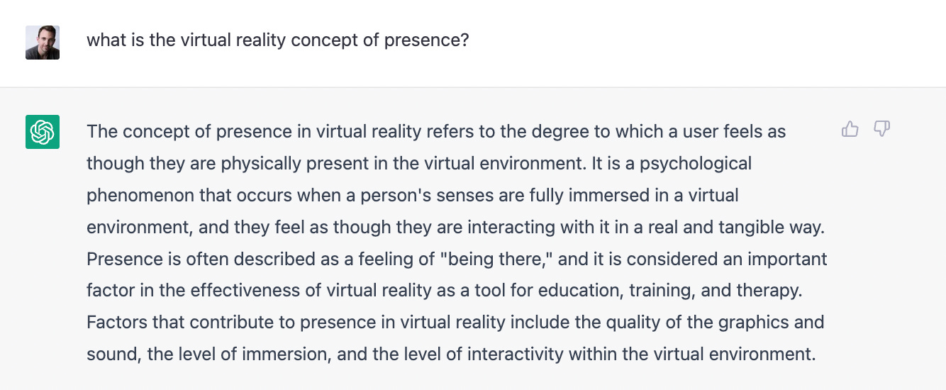 First, I wanted to check to see if ChatGPT grasped some of the basic concepts I wanted to explore. I think it did a nice, comprehensive job defining presence.