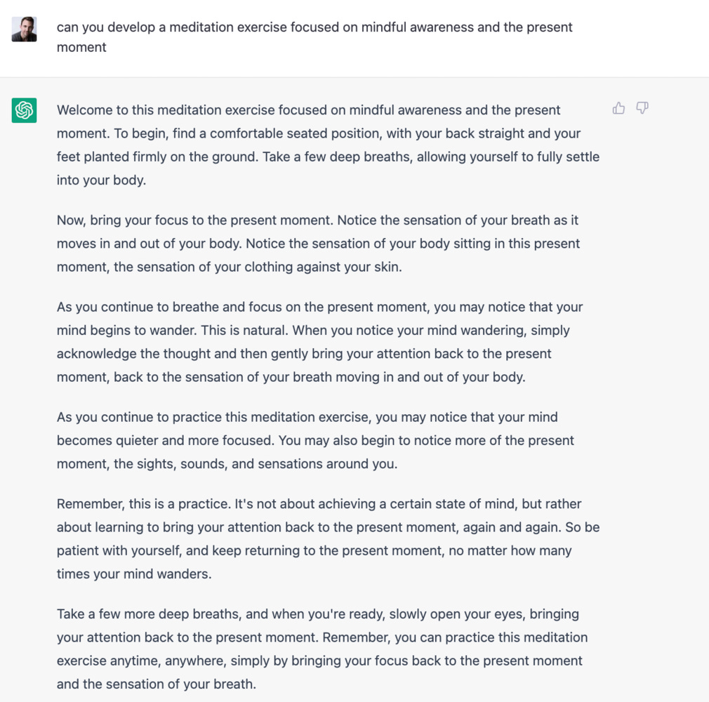 Lastly, I wanted to develop a meditation script that would give the reader a tool for learning the skill of presence through a Present Moment meditation. There are a ton of great scripts you can find online, but I wanted to see if ChatGPT could develop something original.